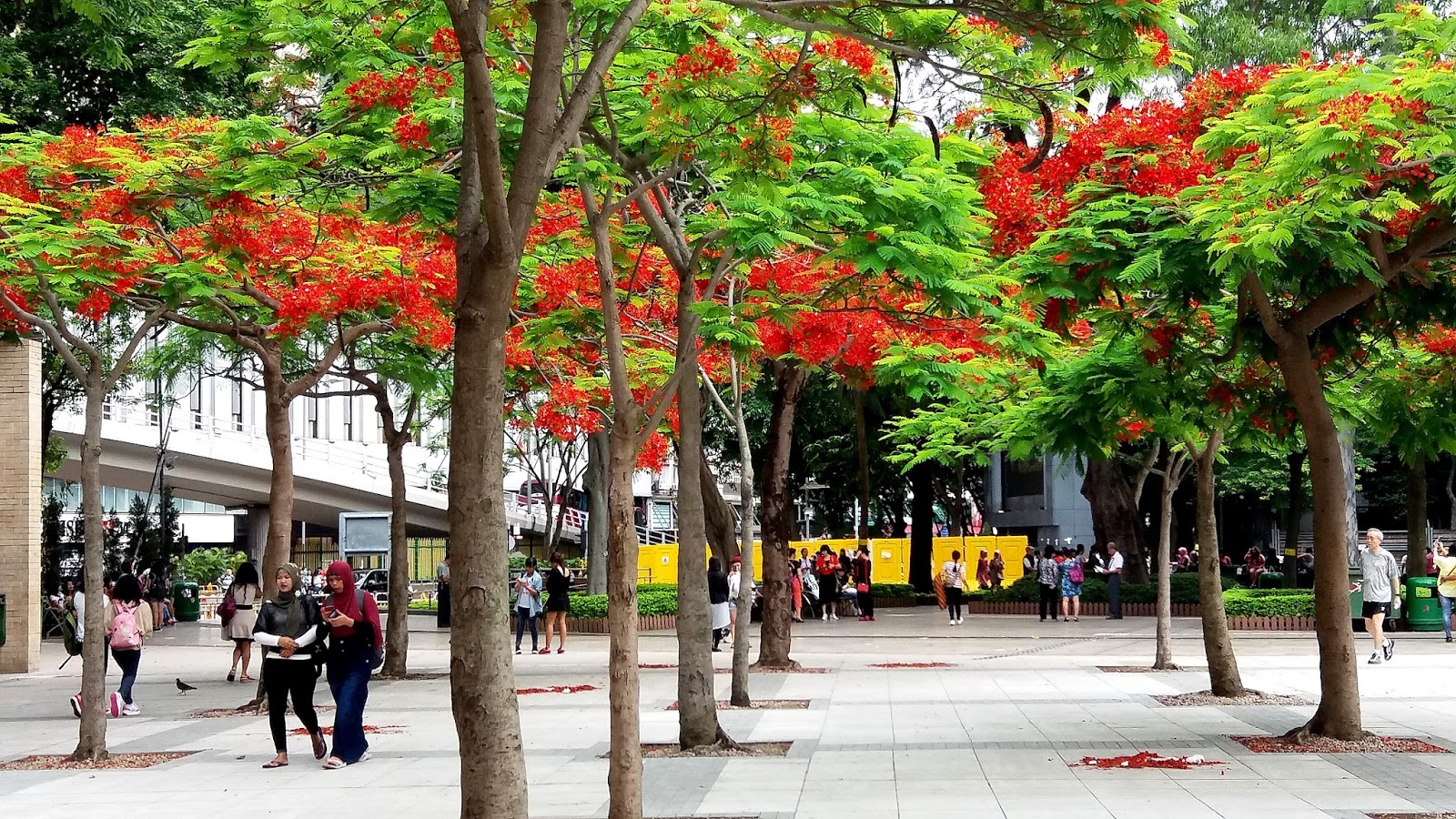 香港島銅鑼灣維多利亞公園近高士威道入口,有數十棵鳳凰木,分為三行分佈有序地生長,五月中花朵盛放,一片火紅,把維多利亞公園變成一個鳳凰花公園,美不勝收。